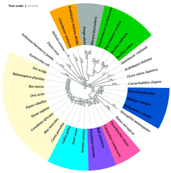 - Tamura, K.; Stecher, G.; Kumar, S. MEGA11: Molecular Evolutionary Genetics Analysis Version 11. Mol. Biol. Evol. 2021, 38, 3022–3027. [Google Scholar] [CrossRef]