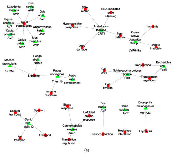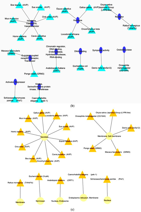 (a) Gene ontology analyses representing the biological process. The green circle represents species and the red circle represents their corresponding biological function. (b) Interaction network reveals the molecular function of the gene from different taxa. The triangle represents genes from different species involved in different molecular functions (blue color). (c) Gene enrichment analyses represents the cellular component. Triangles represent species and their corresponding proteins. Yellow circles represent cellular localization and lines connect each species and its protein to its known cellular localization.