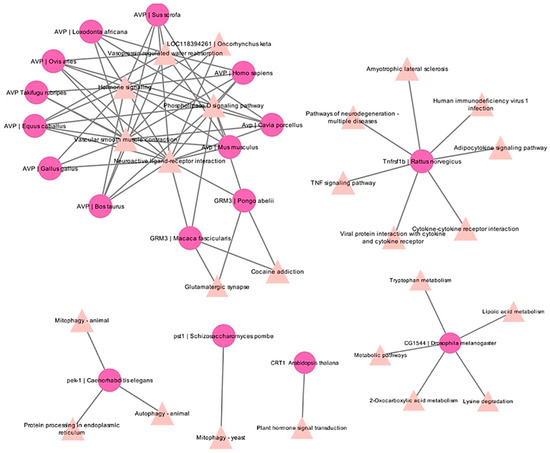 The gene-pathway interaction network illustrates the functional associations between various genes across species and their corresponding KEGG pathways. Nodes in pink circles represent gene-species pairs, while red triangles denote KEGG pathways. Edges indicate functional participation or regulatory involvement of the gene in the respective pathway.