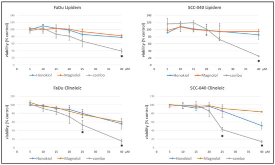 The effect of Lipidem- or Clinoleic-based formulations of HON, MAG, and their combination (combo) on the viability of FaDu or SCC-040 head and neck cancer cells after 48 h incubation. Mean results from four experiments (with nine technical replicates each) are shown ±SD. Statistically significant differences between the effects of both individually applied compounds and their combinations are denoted with an asterisk (t-test, p ≤ 0.05).