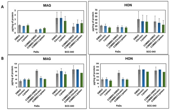 The uptake of HON and MAG from their Lipidem- or Clinoleic-based formulations into FaDu and SCC-040 head and neck cancer cells. (A) Concentrations of HON and MAG determined in the cell lysates, reflecting intracellular uptake. (B) Concentrations of HON and MAG measured in the culture medium, indicating the remaining extracellular fraction. Data are presented as mean values ± standard deviation (SD) from two independent replicates.