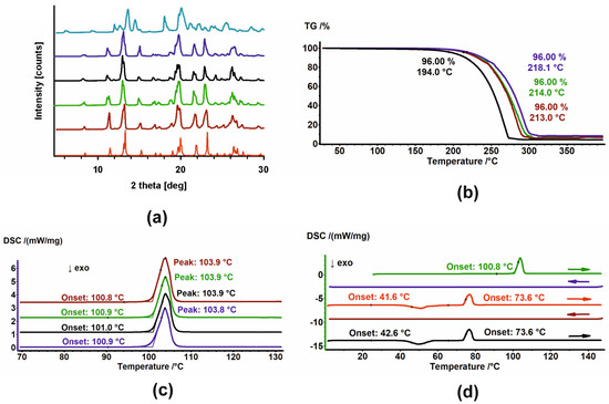 The PXRD patterns registered for unirradiated and irradiated samples of MAG showed no changes in the phase composition. Moreover, their comparison with the pattern generated based on crystal structure from the Cambridge Structural Database (CSD) [31,32] indicates the phases’ identity (Figure 3a). Melting points, with an onset around 110.9 °C, assigned using DSC, also confirmed that samples do not change after irradiation (Figure 3c). Additionally, the thermal properties of their melts were the same. No thermic events were detected in the cooling cycles, while during the heating cycles, first, the exothermic peak of cold crystallization of the melt was observed. Second, the melting endotherm with an onset around 73.6 °C was registered (Figure 3d and Figure A1). The significant change in the melting points of the starting materials and the crystalline materials obtained from the melts undoubtedly indicates the formation of a new, metastable polymorph. The PXRD diffractogram registered after the final DSC heating cycle of MAG differed from the starting one, thus corroborating the creation of a new polymorph (Figure 3a, light-blue pattern). Considering these results, the findings from TGA, which show changes in the thermal stability of the samples, are surprising (Figure 3b). MAG irradiated at 100 kGy is significantly less stable compared to the other three powders, though the reason for this remains unclear.