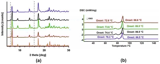In the DSC thermograms, two endothermic peaks are visible (Figure 4b): first, with the onset that changes from 72.8 °C to 76.3 °C depending on the sample (irradiated or not and the dose of radiation), and second, with the stable onset temperature at 86.5 °C. It appears that irradiation affects only the first process. These diffraction patterns and DSC thermograms have been previously described in the literature [33,34,35]. However, no reports have been found regarding attempts to identify the origins of the additional peaks in the diffractograms or the two events in the DSC. Therefore, we conducted a series of experiments to investigate this.