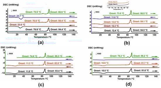 DSC thermograms of (a) HON, (b) HON 25 kGy, (c) HON 100 kGy, and (d) HON 400 kGy in heating–cooling cycles. The thermograms are arranged sequentially from top to bottom; arrows indicate the direction of temperature change. In (b), a zoomed-in view of the second and third heating cycles is shown at the top.