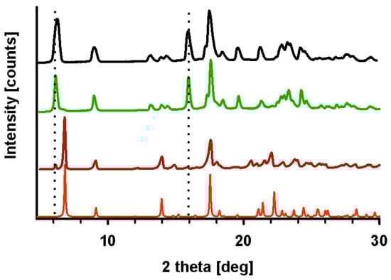 PXRD diffractograms generated based on crystal structures (red), of HON (brown), HON 400 kGy after a few heating–cooling cycles (green), and HON heated to 78 °C (black). Intensities from the P2 phase are marked with dotted lines.
