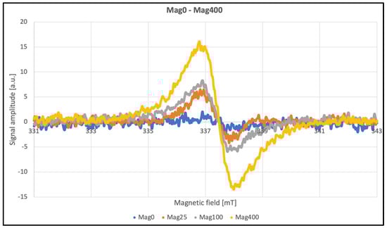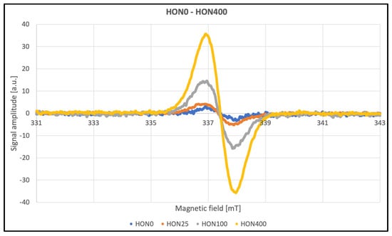 The EPR method was used to detect and characterize free radicals. Overmodulation causes an artificial broadening of the lines, but the signal intensities can still be compared. The EPR spectra for HON and MAG are presented in Figure 7.