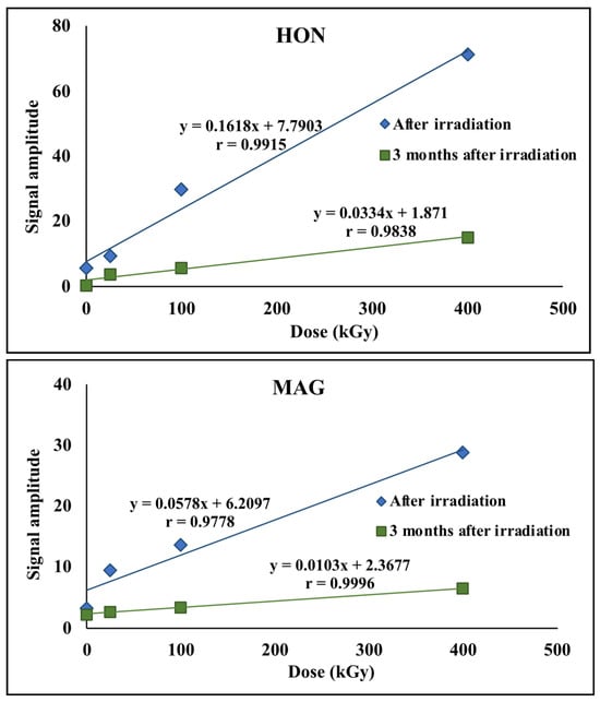 The line widths listed in Table 2 contain information about the amplitude of the second modulation, making these parameters unsuitable for meaningful analysis. After approximately three months, repeated tests were conducted to assess the stability of the paramagnetic centers induced by radiation. Data were collected at a modulation amplitude roughly half the line widths to ensure accurate measurements (Table 2). No significant differences were observed as a function of the radiation dose. The average line width for HON samples was approximately 10 G, while for MAG samples, it was 11 G. According to theory, an even eightfold-lower modulation should be used; however, this was not feasible due to signal intensity limitations. Additionally, the obtained line widths were confirmed using the multiharmonic technique. This method allows for the accurate determination of spectral parameters regardless of the second modulation amplitude. Even significant overmodulation does not pose a problem. Another advantage of this technique is the improvement in the signal-to-noise ratio [36].