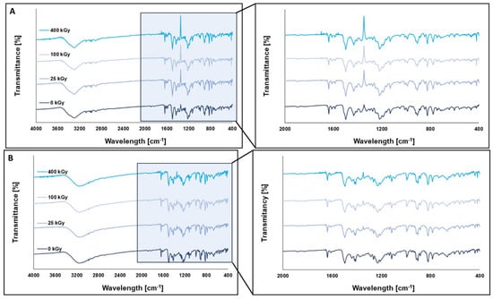 FT-IR spectra of HON (A) and MAG (B) before and after irradiation at a dose of 25 kGy, 100 kGy, and 400 kGy.