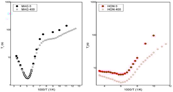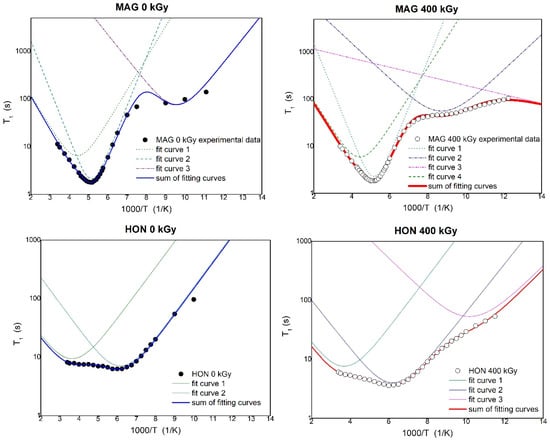 To investigate the impact of ionizing radiation on the molecular dynamics of HON and MAG, spin–lattice relaxation time (T1) measurements were performed using 1H NMR spectroscopy. The activation parameters describing the molecular dynamics of HON and MAG samples irradiated with 0 kGy and 400 kGy were estimated by analyzing the temperature dependence of the spin–lattice relaxation times T1 based on the Bloembergen–Purcell–Pound (BPP) theory [37]. The T1 values depend on dipolar interactions modulated by the internal motions of the molecule. These contributions are additive, and the relaxation rate of the multi-proton system can be determined using the formula below [37,38]: