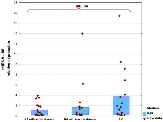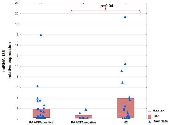 There were no significant differences among the patients divided according to the presence of rheumatoid factor (RF; seropositive vs. seronegative) and the HC group. Details are presented in Supplementary Table S2. Patients with RA seronegative for anti-citrullinated protein antibodies (ACPAs; median; [IQR]: 0.16 [0.12–0.73] had decreased expression of miRNA-186 in comparison to HCs: 0.96 [0.22–3.91]; p = 0.04. Details are presented in Figure 2 and Supplementary Table S3.