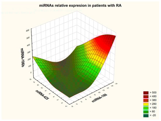 Relative expression of microRNAs in patients with rheumatoid arthritis. The 3D plots were generated using distance-weighted least-squares smoothing, allowing for localized surface fitting based on the proximity of data points. Each axis (X, Y, and Z) represents an independent variable, enabling the simultaneous analysis of three distinct parameters. The color scale ranges from dark green to red, indicating the intensity of the smoothed values—where dark green corresponds to lower values and red to higher ones. This visualization approach facilitates the identification of complex relationships and local patterns within multi-dimensional data.