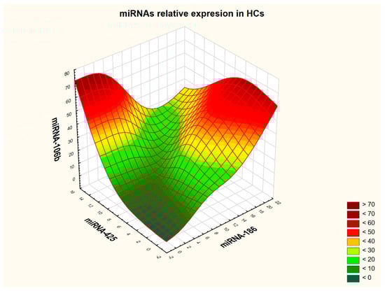 Correlation analysis between individual miRNAs was performed in the RA group and in the HC group, respectively. Details are presented in Table 5 and Table 6. The strongest correlations (≥0.9) were observed among three miRNAs, miRNA 186, miRNA-425, and miRNA-106b, in both the RA patient group and in the control group. The interdependence of expression among these three molecular targets is visualized in Figure 3 and Figure 4. To generate three-dimensional graphs, the distance-weighted least-squares smoothing method was used.