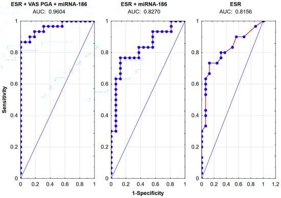 The logistic regression model was used to estimate the ability to assess disease activity in patients with RA, categorized into active and inactive disease groups according to the DAS28 scale. A comparison of the potential utility of the studied miRNAs as additional variables for identifying disease exacerbation is presented in Table 9 and Figure 5.