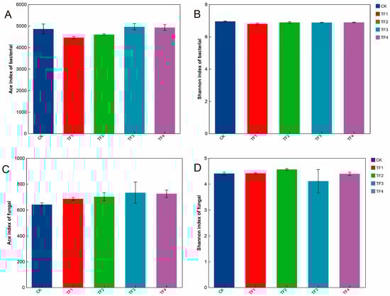ANOVA indicated that the microbial agents did not significantly affect the Ace and Shannon indices of soil bacteria and fungi, compared with the blank control treatment. Additionally, no significant differences were observed among different microbial agents (Figure 1).