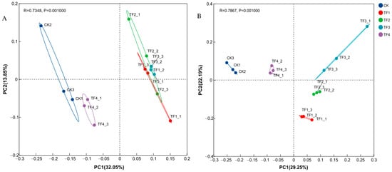 Principal component analysis of bacterial (A) and fungal (B) community structure in rhizosphere under different treatments. CK represents treatment with blank control, TF1 represents treatment with B. subtilis NCD-2 + B. amyloliquefaciens Ba-1, TF2 represents treatment with B. subtilis HMB26553 and B. amyloliquefaciens PHODG36, TF3 represents treatment with B. subtilis WHN-121 and B. amyloliquefaciens G35, and TF4 represents treatment with B. velezensis B31.