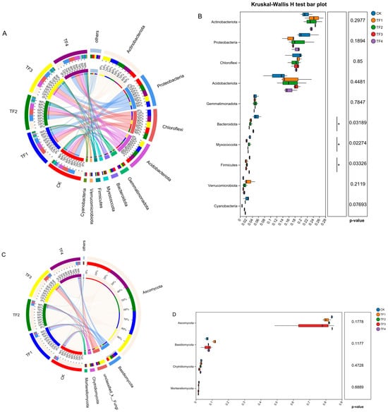 For fungi, the results indicated that the dominant fungal phyla in saline–alkaline soils were Ascomycota, Basidiomycota, unclassified phyla, Chytridiomycota, and Mortierellomycota, and their relative abundances ranged from 70.51% to 83.89%, 6.79% to 11.47%, 2.05% to 18.05%, 2.17% to 3.46%, and 1.53% to 1.88%. Except for the treatment with microbial agent TF3, the average relative abundances of these dominant phyla accounted for over 98% in the other treatments (Figure 3C). A Kruskal–Wallis analysis indicated the relative abundances of Ascomycota, Chytridiomycota, and Mortierellomycota showed a downward trend, while that for Basidiomycota increased in the four microbial agent treatments. However, no significant differences were observed in these phyla, compared with the blank control (Figure 3D).