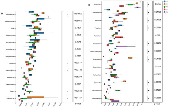 On the other hand, the results of fungal community composition at the genus level indicated that the top 13 dominant and identifiable genera with relative abundances greater than 1% in saline–alkaline soils were Gibberella, Chaetomidium, Alternaria, Fusarium, Penicillium, Sarocladium, Pyrenochaetopsis, Acremonium, Exserohilum, Stachybotrys, Hannaella, Schizothecium, and Clonostachys. A Kruskal–Wallis analysis indicated the relative abundances of Gibberella decreased significantly by 7.95%, 24.61%, 48.18%, and 6.86% under four microbial agent treatments, respectively; the relative abundances of Fusarium also decreased significantly by 23.70%, 44.69%, 45.06%, and 5.44%, respectively, compared with the blank control. For Schizothecium, the relative abundances decreased significantly by 32.19%, 45.77%, and 29.03% under TF1, TF3, and TF4 treatments. In addition, microbial agent treatments significantly increased the relative abundances of Chaetomidium, Alternaria, Sarocladium, Acremonium, and Clonostachys. Meanwhile, the relative abundances of Exserohilum decreased by 22.31%, 18.97%, and 30.54% under TF1, TF2, and TF3 treatments, while that of Stachybotrys increased by 33.15%, 22.71%, and 50.25% under TF2, TF3, and TF4 treatments. The relative abundances of Hannaella were differentially affected under four microbial agent treatments.
