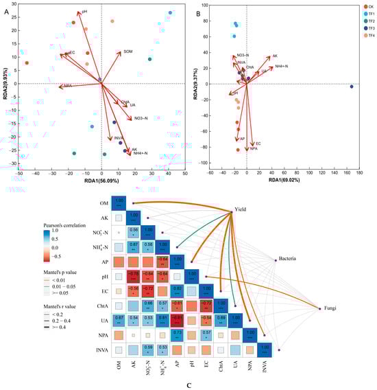 Relationships between soil microbial community, yield, and soil biochemical properties. (A) RDA of rhizosphere bacterial community composition with soil biochemical properties, (B) RDA of rhizosphere fungal community composition with soil biochemical properties, and (C) Pearson’s correlation analysis between soil microbial community structure at the phylum level, yield, and soil biochemical properties. CK represents treatment with blank control, TF1 represents treatment with B. subtilis NCD-2 + B. amyloliquefaciens Ba-1, TF2 represents treatment with B. subtilis HMB26553 and B. amyloliquefaciens PHODG36, TF3 represents treatment with B. subtilis WHN-121 and B. amyloliquefaciens G35, and TF4 represents treatment with B. velezensis B31. * represents 0.01 < p < 0.05, ** represents 0.001 < p < 0.01, *** represents p < 0.001, respectively.