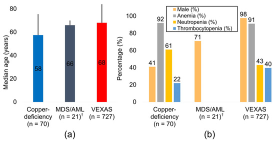 Clinical and hematologic profiles by etiology. (a) Pooled median age for copper deficiency (n = 70), vacuolated cell MDS/AML (n = 21) †, and VEXAS syndrome (n = 727). Central numerals denote the median; vertical error bars indicate the 95% confidence interval. (b) Prevalence of male sex, anemia, neutropenia, and thrombocytopenia in the same three diagnostic groups. † Estimates for the MDS/AML group derive from a single institutional cohort and should be interpreted cautiously. Abbreviations: AML, acute myeloid leukemia; CI, confidence interval; MDS, myelodysplastic syndrome.