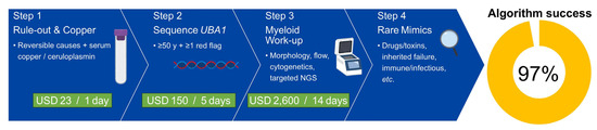 In adults meeting clinical “red flags”, Step 1–2 (serum copper/ceruloplasmin followed, when non-diagnostic, by UBA1 hotspot sequencing) correctly classified 97% of cases within <5 days at a median laboratory cost of ~USD 173; broad myeloid next-generation sequencing was reserved for the UBA1-negative minority.