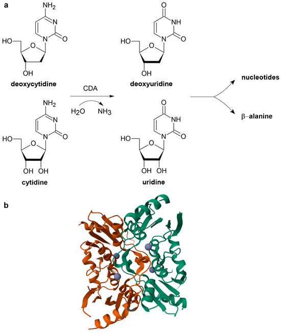 Role of CDA and its structure. (a) Simplified scheme of CDA’s role in nucleotide metabolism. (b) The tetrameric structure of CDA (PDB: 1MQ0; https://www.rcsb.org/structure/1MQ0, accessed on 5 August 2025), which is formed by two dimers (shown in brown and green colors). Zinc ions are shown as violet spheres.