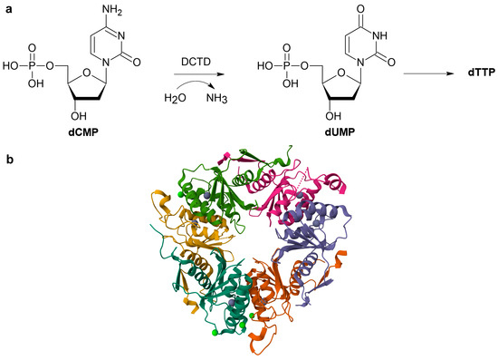 Role of DCTD and its structure. (a) Simplified scheme of DCTD’s role in nucleotide metabolism. (b) The hexameric structure of DCTD (PDB: 2W4L; https://www.rcsb.org/structure/2W4L, accessed on 5 August 2025). The catalytic zinc ions are shown as violet spheres. Chlorine ions are shown as green spheres.