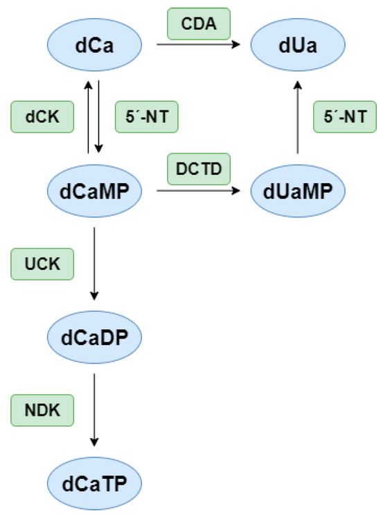 Simplified scheme of the activation and inactivation pathways of cytidine analogs (dCas). dUa—2′-deoxyuridine analog; dCaMP, dCaDP, dCaTP—mono-, di-, triphosphate form of dCas; dUaMP—monophosphate form of dUa; dCK—deoxycytidine kinase; UCK—UMP-CMP kinase; NDK—nucleoside diphosphate kinase; CDA—cytidine deaminase; DCTD—dCMP deaminase; and 5′-NT—5′-nucleotidases. Adapted from [21].
