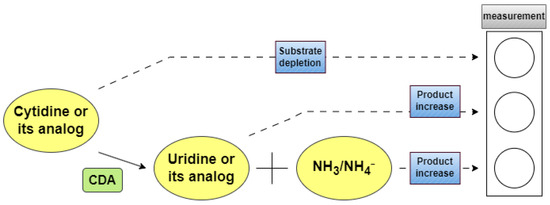 When determining CDA activity, analytical strategies most commonly involve tracking the decrease in cytidine substrates or quantifying the reaction products, namely uridine (or deoxyuridine) and ammonia (Figure 4). Similarly, for DCTD, activity is typically assessed based on the formation of dUMP or ammonia, or the depletion of dCMP.