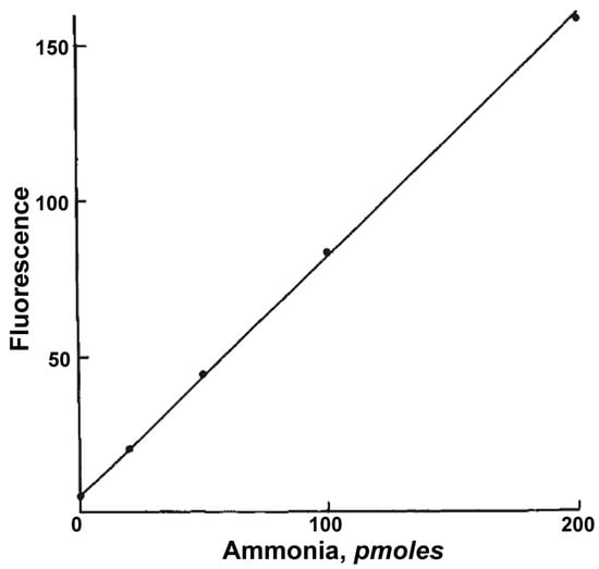 Beyond colorimetric absorption-based methods, ammonia released by deamination reactions can also be quantified using highly sensitive fluorescence methods. These methods typically rely on ammonia reacting with a fluorogenic reagent, such as o-phthaldialdehyde (OPA), in the presence of a thiol compound, producing an intensely fluorescent product [17,50,51]. Mroz et al. (1982) described a modification of such a method, where they used OPA with thioglycolic acid (instead of mercaptoethanol) at pH 7.4, resulting in improved specificity for ammonia. Fluorescence measurement was taken at least 45 min after mixing the reagents, with excitation wavelengths in the 400–440 nm range and emission measured above 455–475 nm. This method enabled the determination of picomolar to subpicomolar amounts of ammonia (Figure 7) [50].