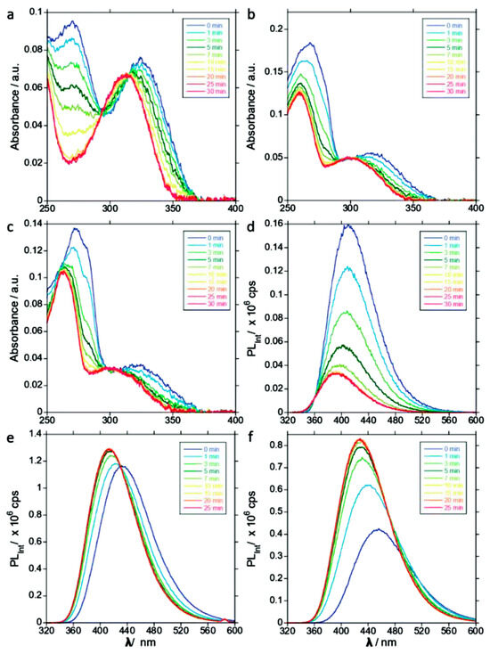 An example of the measurement of CDA activity using direct fluorimetric assay. Steady state absorption traces of (a) tzC, (b) thC, and (c) mthC CDA-mediated conversion to tzU, thU, and mthU, respectively, over a time range from 0 to 30 min; steady state emission traces of (d) tzC, (e) thC, and (f) mthC CDA-mediated conversion to tzU, thU, and mthU, respectively, over a time range from 0 to 30 min. For clarity, the curves show a time course (0, 1, 3, 5, 7, 10, 15, 20, 25, and 30 min), progressing from the initial state at 0 min (blue) to the final state at 30 min (dark red/purple). The final time point in panels (e,f) is 25 min. Adapted from [53].