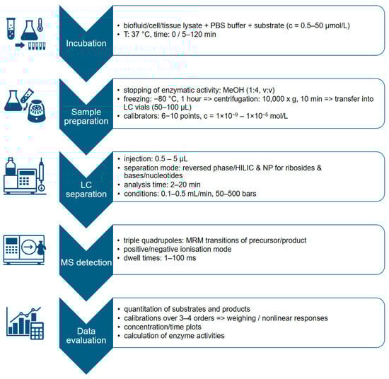 LC, especially HPLC, is one of the techniques used to determine the enzymatic activity of CDA and DCTD. Modern approaches combine LC with mass spectrometry (LC-MS or LC-MS/MS), allowing not only the quantification of substrates and products, but also enzyme inhibitors such as tetrahydrouridine (THU), directly in biological matrices [76,77]. These methods are significantly more sensitive than traditional spectrophotometric or radioactive methods, and provide accurate results without the need for substrate labeling or synthetic modifications that could affect the kinetics of enzymatic reactions [78]. The schematic workflow for measuring enzyme activity using LC-MS is shown in Figure 9.