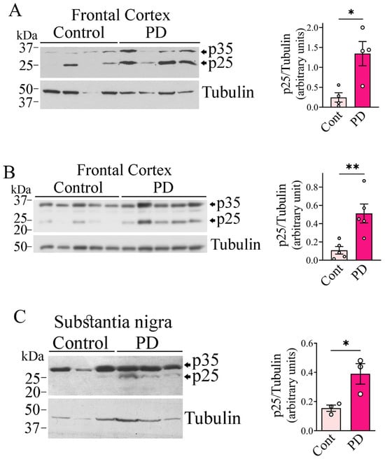 Figure 1A,B) compared to age-matched controls. Additionally, we observed up to a 4-fold increase in p25 levels in the substantia nigra of PD patients (