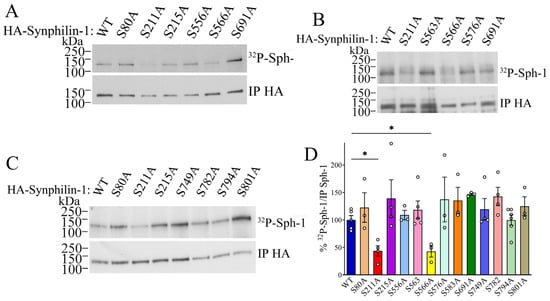 Figure 3A–D). In contrast, other putative phosphorylation-deficient synphilin-1 mutants showed no significant change in phosphorylation levels compared to the wild-type protein (