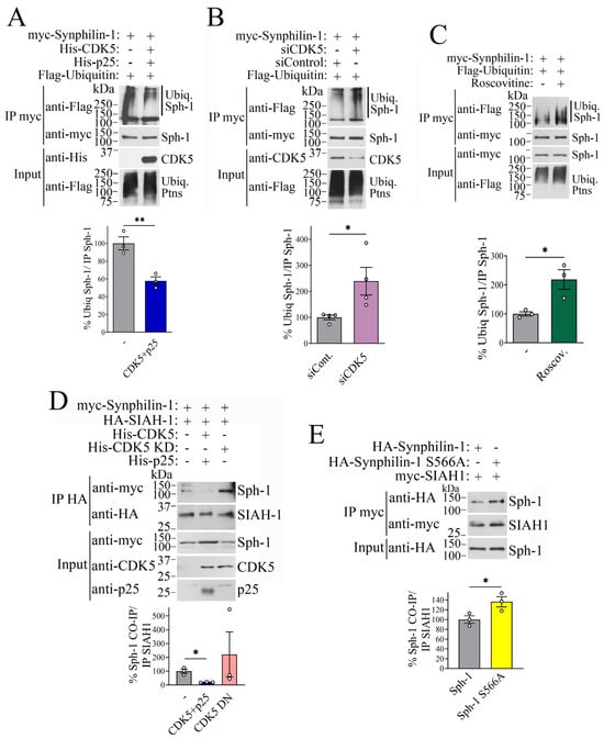 Figure 5D). These findings suggest that the reduced interaction is dependent on CDK5 kinase activity and its ability to phosphorylate synphilin-1, rather than on the presence of CDK5 protein itself. To further validate these findings, we examined the interaction between SIAH1 and the CDK5 phosphorylation-deficient S566A mutant. Cells were co-transfected with SIAH1 and either wild-type synphilin-1 or the S566A mutant. We observed that the S566A mutant co-immunoprecipitated with SIAH1 more than the wild-type protein (