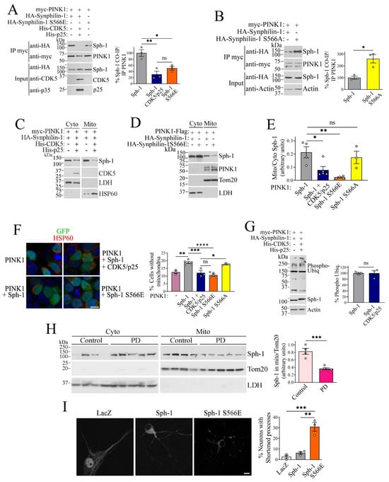 43]. In this study, we propose that post-translational modifications could render synphilin-1 toxic to neurons in PD. Specifically, we demonstrate that synphilin-1 is a substrate of CDK5. Using site-directed mutagenesis and mass spectrometry, we identified serine 566 as the site of phosphorylation by CDK5 in the presence of p25. This phosphorylation decreases synphilin-1′s ability to interact with SIAH1, which in turn reduces its ubiquitination and proteasomal degradation. Consequently, CDK5-phosphorylated synphilin-1 exhibits an extended half-life, leading to its accumulation in cells and neurons. Furthermore, CDK5 phosphorylation impairs the interaction between synphilin-1 and PINK1, reducing its ability to translocate to mitochondria and support mitophagy via the PINK1-synphilin-1 pathway. In line with this, the phosphorylation-mimicking mutant of synphilin-1 (S566E) shows decreased mitochondrial translocation and diminished mitophagy-promoting activity. Most importantly, we observed that PD brains accumulate p25, exhibit reduced synphilin-1 levels in mitochondria, and show evidence that CDK5-phosphorylated synphilin-1 contributes to the retraction of neuronal processes. These findings suggest that CDK5 phosphorylation alters synphilin-1 the intracellular distribution of synphilin-1, impairs its role in basal mitophagy, and disrupts the maintenance of neuronal processes, potentially contributing to neuronal dysfunction in PD.