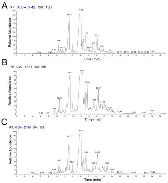 The chromatogram shows various components identified from the (A) acetone, (B) methanol, and (C) chloroform extracts of C. myrrha, obtained through GC-MS analysis.