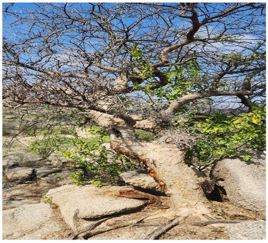 C. myrrha gum resin was collected in the summer from a four-year-old tree from various locations in Wadi Lajab, southwest of the Jazan region, Saudi Arabia (Figure 2). During the harvesting process, the tree bark was tapped three times with an ax. The tree was then left exposed to sunlight to allow the resin to dry and harden. Once it had solidified, the resin was carefully scraped off the bark. After harvesting, the resins were collected in a glass basin and purified by removing any remaining impurities, such as bark, leaves, and sand. The Flora and Phytotaxonomic Section in the Biology Department of Jazan University’s Faculty of Science was responsible for identifying the plant resins. The herbarium of Jazan University’s Biology Department holds samples, which have been assigned voucher numbers.