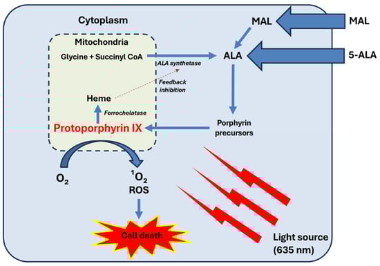 Mechanism of action of PDT. Exogenous ALA or MAL are taken up by cells. MAL needs to be hydrolyzed to ALA by intracellular esterases. ALA enters the heme biosynthesis pathway. Within the mitochondria, glycine and succinyl-CoA are converted into ALA by the enzyme ALA synthetase. This step is tightly regulated by negative feedback from heme, preventing excessive production of intermediates. ALA progresses through the porphyrin biosynthetic pathway, eventually forming PpIX. In normal conditions, PpIX is converted into heme by ferrochelatase. However, in tumor cells, reduced ferrochelatase activity leads to the preferential accumulation of PpIX. Upon exposure to a light source (usually at 635 nm), PpIX becomes activated, leading to the generation of singlet oxygen (1O2) and other ROS, such as superoxide anion radicals (O2−), hydrogen peroxide (H2O2), and hydroxyl radicals (•OH). These ROS induce oxidative damage to cellular structures, resulting in selective tumor cell death. Reproduced from E Garcia-Mouronte et al. [].