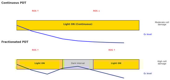 Light fractionation is defined as the delivery of the total therapeutic light dose in two or more discrete fractions separated by dark intervals, rather than by a single continuous exposure. This strategy, initially inspired by radiotherapy protocols, is based on the oxygen-dependent nature of PDT []. During continuous illumination, rapid oxygen consumption can lead to hypoxia, thus limiting the effectiveness of singlet oxygen-mediated cytotoxicity. Introducing a dark interval allows for the partial restoration of oxygen levels within the treated tissue, leading to more effective ROS generation upon subsequent light exposure (Figure 2) [,,].