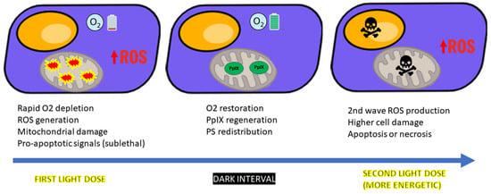 The subsequent, more energetic second light fraction then acts on a cellular environment already destabilized by oxidative stress, leading to irreversible apoptosis or secondary necrosis. These sequential events occurring in tumor cells are schematically summarized in Figure 3.
