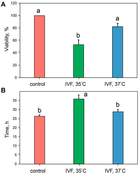 Embryo response to reduced incubation temperature. (A) The impact of different incubation temperatures during the first 24 h following IVF on the survival of embryos at the third division stage was assessed. All embryos in the control group reached the 8-cell stage. (B) Duration of the second cell division: a,b—different letters denote groups that differ significantly (LSD test, p < 0.05).