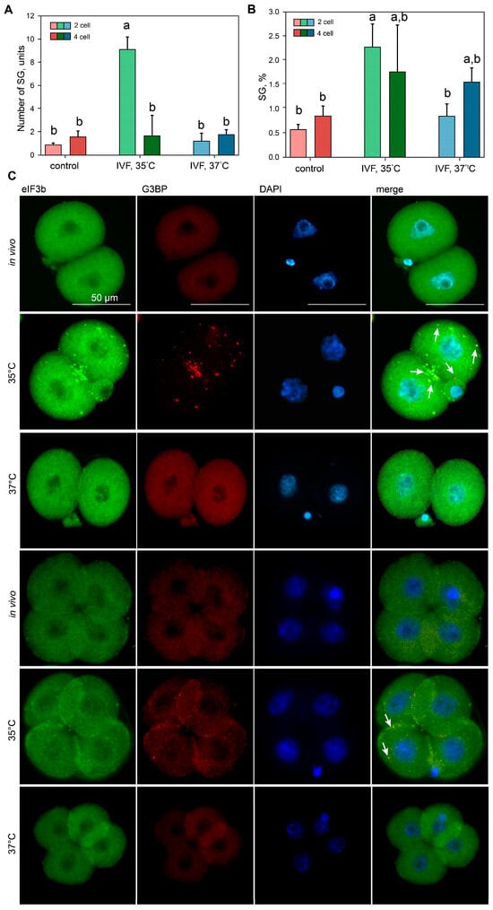 Staining was performed in a sterile Petri dish wrapped in foil. Two- and four-cell embryos were fixed in 10% formalin for 10 min, then washed three times in PBS + 1% TritonX100 (PBST). The embryos were permeabilized with 0.5% Triton-X-100 for 10 min, washed three times in PBS, and blocked with blocking buffer (3% BSA + 1% TritonX100) for 5 min, followed by three PBS washes. The embryos were transferred to a drop containing primary antibodies anti-eIF3b (sc-16377, SCBT, Santa Cruz, CA, USA) and anti-G3BP (611126, BD Transduction, Franklin Lakes, NJ, USA) at a 1:200 dilution and incubated for 1 h at room temperature. After three washes, the embryos were incubated with secondary antibodies anti-goat AlexaFluor 488 (Invitrogen, Carlsbad, CA, USA) and anti-mouse AlexaFluor 555 (Invitrogen) for 1 h at room temperature. Embryo nuclei were stained with 0.01% DAPI for 1 min after three washes. Images were taken with an upright epifluorescence microscope (Axio Imager 2, Carl Zeiss, Oberkochen, Germany) using a 40× objective lens, a laser scanning microscope LSM 780 NLO (Carl Zeiss, Oberkochen, Germany) using a 40× and 100× objective lenses, and an upright epifluorescence microscope (Axio Imager.M2 Colibri 7, Carl Zeiss) using a 40× and 100× objective lenses. Image assembly was performed using Fiji ImageJ 2.15. For experimental validation, we reacted the inhibitor of eIF2α (the α subunit of eukaryotic translation initiation factor 2) and an inhibitor of phosphorylation of PERK kinase assembly of these agglomerates under lower incubation temperature conditions in the IVF, 35 °C group. Stress granule modulators salubrinal (20 μM; SML0951, Sigma-Aldrich, Saint-Louis, MO, USA, an eIF2α dephosphorylation inhibitor) or GSK2606414 (5 μM; Sigma-Aldrich 516535, Saint-Louis, MO, USA, a PERK kinase inhibitor) were added to the culture medium after in vitro fertilization.