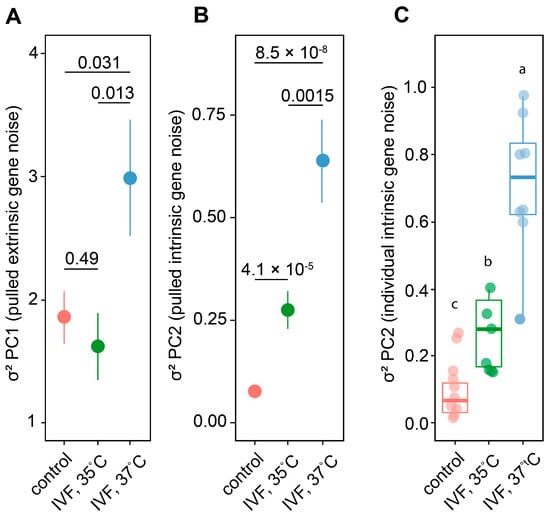 The impact of different temperature IVF conditions on the “extrinsic” (intra-individual) /“intrinsic (inter-individual) (FA)” gene noise in left/right forelimbs. Colors represent different experimental groups: control (red), IVF at 35 °C (green), and IVF at 37 °C (blue). (A,B) The impact of different temperature IVF conditions on the pulled variance (σ2) of “extrinsic (PC1)” and “intrinsic” gene expression noise in the control and experimental (IVF, 35 °C and IVF, 37 °C) groups. Numbers indicate significance level between group differences at FDR < 0.05 for multiple comparisons by t-test. (C) The impact of different temperature IVF conditions on the individual variance (σ2) of “intrinsic” gene noise (PC1) for each animal in the control (n = 6) and experimental IVF, 35 °C (n = 7) and IVF, 37 °C (n = 8) groups. Dots indicate individual variance values of “intrinsic” gene noise (PC2). Letters indicate significant between-group differences at LSD < 0.05 for multiple comparisons by ANOVA test.