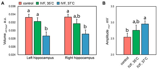 The impact of temperature conditions during the first embryonic cell division on the hippocampus volume and startle reflex of the offspring. Relative hippocampal volume (A) and maximum startle reflex amplitude (B) in offspring. The data is presented as mean ± standard error: a,b—significant between-group differences (LSD test, p < 0.05).