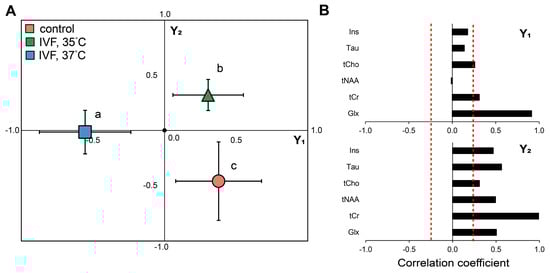 The impact of incubation conditions during the first embryonic cell division on the offspring’s brain metabolism. (A) PLS-DA plots of brain metabolites. Group segregation in PLS-DA space (Y1/Y2 axes) following temperature manipulation during initial cell division. (B) Correlation coefficients of individual metabolites showing the relationships between neurometabolite concentration changes and the composite metabolic patterns (Y1/Y2 axes) captured PLS-DA dimensions. Data are presented as mean ± SE. Asterisks indicate significant differences from control animals (p < 0.05; post-hoc LSD test, one-way ANOVA). Letters indicate significant differences in the IVF, 35 °C group animals (p < 0.05; post hoc LSD test, one-way ANOVA) from control and IVF, 37 °C groups. The red dashed line shows the statistical significance threshold for the correlation coefficient (p < 0.05).