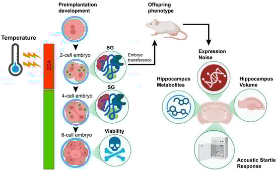 The preimplantation stage of pregnancy is characterized by high rates of embryonic loss. After in vitro fertilization, only 30–50% of fertilized eggs reach the blastocyst stage. The reasons for this phenomenon are not fully understood. The preimplantation period represents a critical window of vulnerability, as it is a time of global epigenetic reprogramming in embryos. Perturbations in environmental conditions capable of disrupting DNA methylation patterns during this phase may predispose offspring to adverse health outcomes. For example, thermal stress has been shown to impact metabolic processes, the intracellular matrix, the epigenetic landscape, and apoptotic pathways. Collectively, this leads to impaired embryonic development and increased embryonic mortality [3,4,5]. The loss of global DNA methylation during reprogramming initiates zygotic genome activation (ZGA), a process essential for normal embryogenesis. Investigations into the effects of temperature modulation during ZGA have demonstrated that increased intra-embryonic variability of 5mC methylation at the two- and four-cell stages is increased and subsequently normalized to in vivo levels by the eight-cell embryos incubated at 35 °C [6].