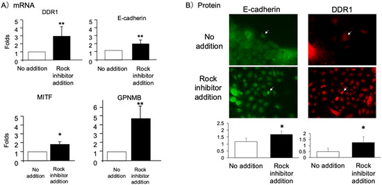 Y27632 Upregulates Gene Expression in the iMc–Keratinocyte Co-Culture System. (A) Human iPSC-derived melanocytes (iMc) and primary keratinocytes were co-cultured in the presence or absence of the ROCK inhibitor Y27632 (10 μM) for 3 days. mRNA expression levels of adhesion molecules (E-cadherin, DDR1), and in addition, melanocyte-specific genes (MITF (TF), GPNMB; analyzed in iMc monoculture) were quantified by RT-qPCR. (B) Protein expression levels of E-cadherin, DDR1 were evaluated under the same culture conditions. White arrows indicate iMc. Data are presented as mean ± SEM from independent experiments. Statistical significance was determined by unpaired two-tailed t-test: * p < 0.05; ** p < 0.001; N.S., not significant.