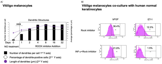 In prior work, we demonstrated that the ROCK inhibitor Y-27632 could upregulate bFGF expression in co-cultures of primary melanocytes derived from vitiligo patients and keratinocytes. In this study, ROCK inhibition also visibly restored dendritic architecture of vitiligo melanocytes within 24 h, quantified using a novel imaging-based scoring system, detail see materials and Methods, the Melanocyte Dendritic Imaging Score (MDIS) (Figure 2A).