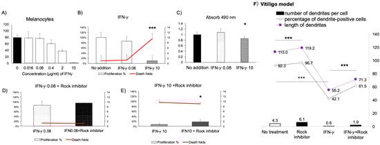 ROCK Inhibitor Rescues IFN-γ–Induced Dysfunction in iMc (A) iMc were treated with increasing concentrations of IFN-γ, and cell viability was assessed using the MTS assay. (B,C) In the iMc–keratinocyte co-culture system, IFN-γ induced melanocyte death and inhibited proliferation (B) as well as melanin synthesis (C). (D,E) Co-administration of the ROCK inhibitor Y27632 restored cell viability and proliferation under low (0.08 ng/mL, D) and high (10 ng/mL, E) IFN-γ conditions. (F) ROCK inhibition also rescued dendritic structure loss induced by 0.08 ng/mL IFN-γ, as quantified using the melanocyte dendritic imaging score (MDIS) method. * p < 0.05; *** p < 0.0001. Comparisons were made between indicated two groups or against the untreated control group as specified.
