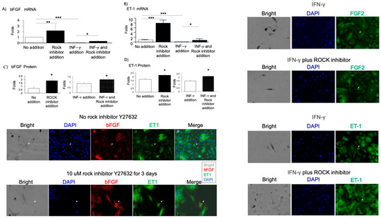 Building on these findings, we directly tested whether ROCK inhibition could reverse IFN-γ–mediated suppression of bFGF and ET-1 in the iMc–keratinocyte co-culture system. RT-qPCR and immunofluorescence staining revealed that both mRNA and protein levels of bFGF and ET-1 were significantly downregulated upon IFN-γ (80 pg/mL) treatment (Figure 5A,B). However, Y-27632 supplementation markedly restored expression levels of both factors, consistent with observations in primary melanocyte cultures. Quantitative image analysis confirmed this rescue effect, with partial but statistically significant recovery of bFGF and ET-1 expression in the presence of both IFN-γ and the ROCK inhibitor (Figure 5C,D).